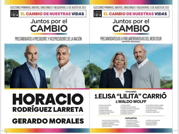 Rodríguez Larreta, por su parte, eligió la frase «El cambio de nuestras vidas», con la foto principal del jefe de Gobierno porteño y su compañero de fórmula, el gobernador jujeño Gerardo Morales. Acompañan en la segunda hoja los precandidatos a parlamentarios en el Mercosur, Elisa Carrió y Waldo Wolff.