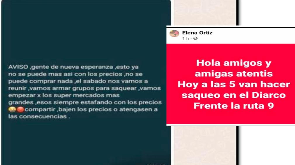 Por otra parte, la Comisaría Comunitaria N° 32 de Nueva Esperanza detuvo a Mariela Judith Gómez, de 25 años, con domicilio en el barrio Virgen de Huachana de esta ciudad cabecera del departamento Pellegrini, donde se secuestró un teléfono celular desde donde se habría realizado una publicación en un grupo de WhatsApp convocando a la comisión del mencionado delito.