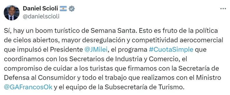 A través de una publicación en la red social X, Scioli celebró el «boom turístico» que se generó el fin de semana extralargo de Semana Santa y aseguró que los altos niveles de ocupación hotelera son «fruto de la política de cielos abiertos, mayor desregulación y competitividad aerocomercial que impulsó el presidente Javier Milei». Además, destacó la implementación del programa Cuota Simple y otras gestiones del gobierno libertario, del que es parte.