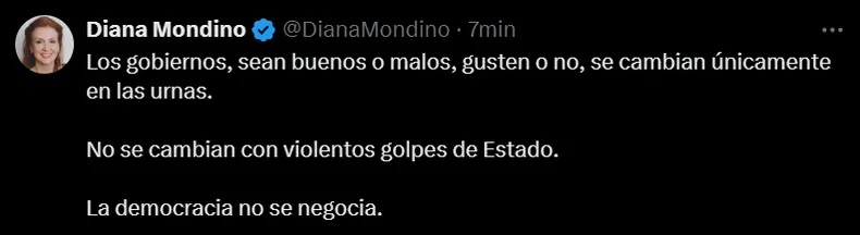 «Los gobiernos, sean buenos o malos, gusten o no, se cambian únicamente en las urnas. No se cambian con violentos golpes de Estado. La democracia no se negocia», escribió la funcionaria en su escueto mensaje en la cuenta de X.