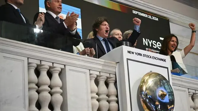 El presidente, Javier Milei, participó de la apertura de la jornada bursátil en la Bolsa de Valores de Nueva York, donde además realizó el tradicional toque de campana que indica el inicio de operaciones.